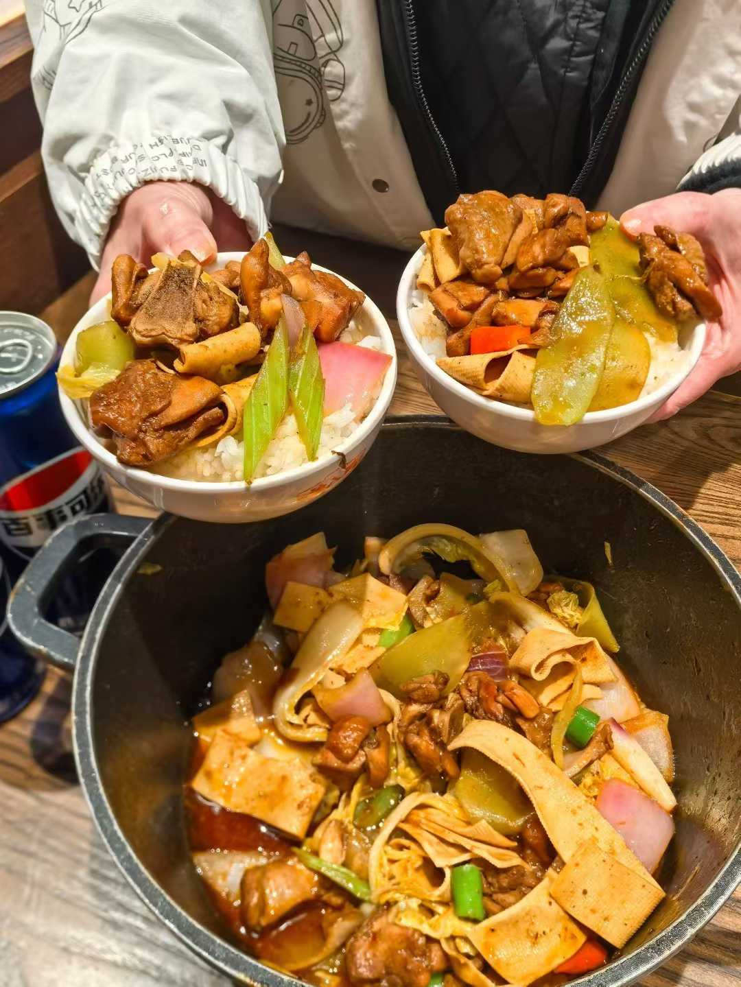 饭点到啦!来一锅热腾腾的渝八两鸡公煲,那浓郁醇厚的香气瞬间在空气中弥漫开来,直钻鼻腔,撩拨着每一个味蕾。揭开锅盖,只见色泽红亮的汤汁咕嘟咕嘟地翻滚着,鸡肉在汤汁中若隐若现,被炖煮得恰到好处,每一块都裹满了秘制酱料的精华,泛着诱人的光泽。